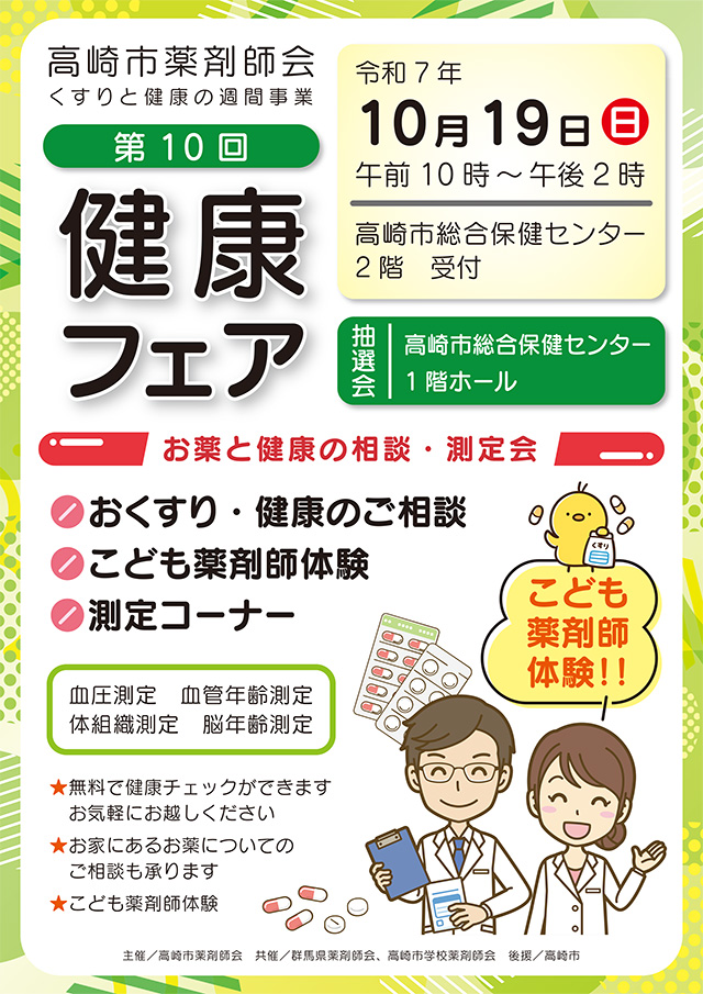 高崎市薬剤師会 第10回健康フェア 開催のお知らせ 開催概要 日時 2025年10月19日(日)10:00~14:00 会場 高崎市総合保健センター 2階 受付(高崎市高松町5-28) 内容 『お薬と健康の相談・測定会』 おくすり・健康のご相談 こども薬剤師体験 測定コーナー(血圧・血管年齢・体組織・脳年齢) 参加費 無料 PDFダウンロード PDFでチラシを見る