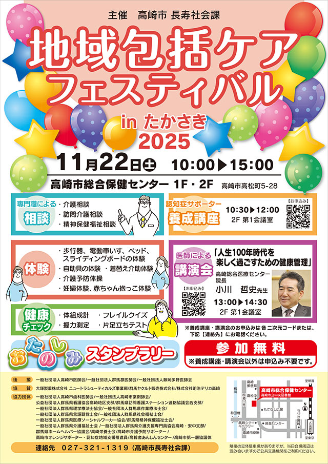 地域包括ケアフェスティバル in たかさき 2025 開催のお知らせ 弊社がお手伝いさせていただいております「地域包括ケアフェスティバルinたかさき2025」開催のお知らせです参加無料ですのでお気軽にご参加ください!※養成講座・講演会以外は申込み不要です。 開催概要 日時 2025年11月22日(土)10:00~15:00 場所 高崎市総合保健センター 1F・2F (高崎市高松町5-28) イベント内容 【専門職による相談】 ・介護相談 ・訪問介護相談 ・精神保健福祉相談 【体験】 ・歩行器、電動車いす、ベッド、スライディングボードの体験 ・自助具の体験 ・着替え介助体験 ・介護予防体操 ・妊婦体験、赤ちゃん抱っこ体操 【健康チェック】 ・体組成計 ・フレイルクイズ ・握力測定 ・片足立ちテスト 【お楽しみスタンプラリー】 【認知症サポータ養成講座】 10:30~12:00 2F第1会議室 《要お申込み》 【医師によ講演会】 13:00~14:30 2F第1会議室 《要お申込み》 「人生100年時代を楽しく過ごすための健康管理」 高崎総合医療センター 院長 小川哲史先生 などぜひお越しください! 主催 高崎市 長寿社会課お問い合わせ:027-321-1319 リーフレット(PDF)ダウンロード PDFでリーフレットを見る