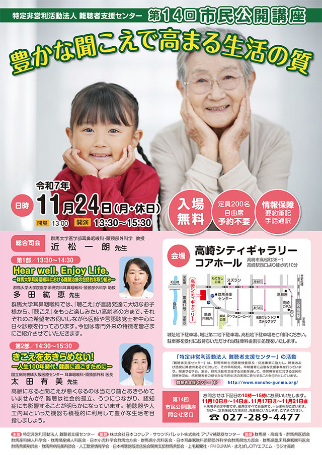 難聴者支援センター 第14回市民公開講座 のお知らせ 開催概要 日時 2024年11月24日(月祝)13:30~15:30(13:00開場) 会場 高崎シティギャラリー コアホール(高崎市高松町35-1) プログラム 【総合司会】近松一朗 先生(群馬大学医学部耳鼻咽喉科・頭頸部外科学 教授) 第1部/13:30~14:30 【講演】『Hear well. Enjoy Life.~群馬大学耳鼻咽喉科における難聴治療の包括的な取り組み~』 【講師】多田紘恵 先生(群馬大学大学院医学系研究科耳鼻咽喉科・頭頸部外科学 助教) 第2部/14:30~15:30 【講演】『きこえをあきらめない!―人生100年時代、健康に過ごすためにー』 【講師】太田有美 先生(国立病院機構大阪医療センター 耳鼻咽喉科・頭頸部外科 医長) 参加費 無料 定員 200名(自由席 予約不要) 情報保障 要約筆記、手話通訳 PDFダウンロード PDFでチラシを見る 関連リンク ■認定NPO法人 難聴者支援センター HPhttp://nancho-gunma.org/